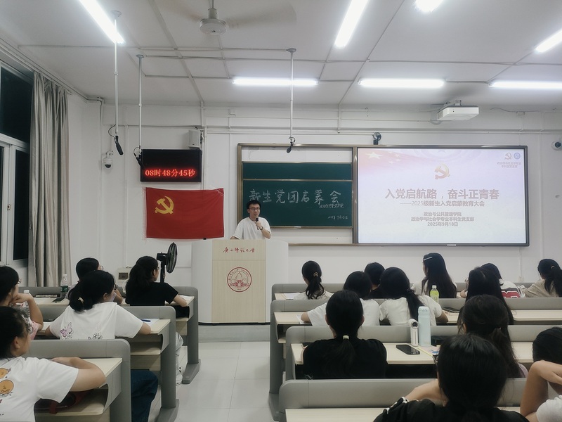 为强化新生理想信念教育,引导青年学生坚定政治信仰、积极向党团组织靠拢,政治与公共管理学院于9月18日晚在文一教学楼304、305教室组织开展“传承红色基因,点燃信仰之光”新生党团启蒙教育活动。学院团委书记兼新生辅导员文佳慧,本科生党支部书记林俊霖、何加嘉,各本科生党支部委员、新生班级助理及2025级全体新生参加活动。