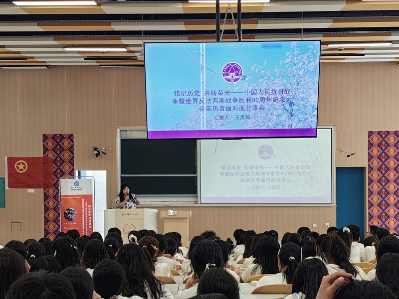 9月3日,备受瞩目的中国人民抗日战争暨世界反法西斯战争胜利80周年纪念大会在北京天安门广场隆重举行,王孟筠老师受邀亲临现场,见证了这一承载历史荣光与彰显和平信念的国家盛典。分享会现场,她以第一视角,讲述了其作为观礼嘉宾的所见所闻所感,将现场的震撼与感动带回校园与我院2025级新同学分享。她结合现场拍摄的影像资料,从阅兵现场的宏观场面到细微之处,为同学们生动描绘了仪式现场的震撼画面,展示了受阅部队官兵英姿飒爽、意气风发的精神面貌,以及国产新型主战装备所展现出的中国国防和军队现代化建设的巨大成就。她鼓励新同学,作为新时代的大学生,要铭记历史、缅怀先烈、珍爱和平、勇担使命,传承抗战精神,坚定理想信念,将个人成长与国家发展紧密结合,为实现中华民族伟大复兴贡献力量。