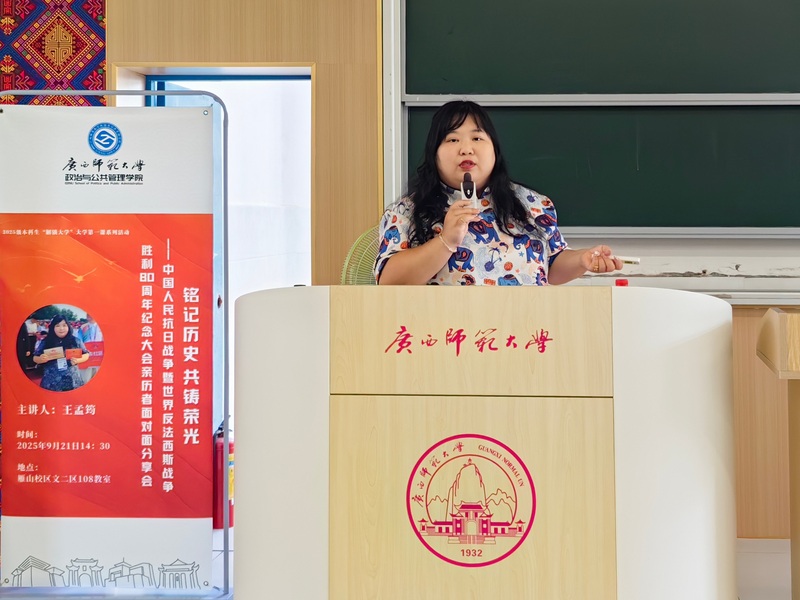 9月21日,政治与公共管理学院围绕铭记历史 共铸荣光主题,组织开展中国人民抗日战争暨世界反法西斯战争胜利80周年纪念大会亲历者面对面分享会。活动由2025级辅导员文佳慧老师主持,特邀政治学系王孟筠老师担任主讲嘉宾。