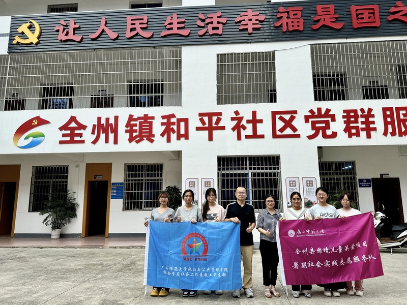 为深入贯彻党的二十大关于 “加强普惠性、基础性、兜底性民生建设”的部署,落实《中华人民共和国未成年人保护法》对困境儿童权益保障的要求,2025年7月至8月,广西师范大学政管学院“强国行”专项行动暨广西师范大学社会实践重点项目团队,在王波老师的带领下,7名社会工作专业学生共赴桂林市全州县,参与深圳市东西方社工服务社主导的“全州县困境儿童关爱服务试点项目”,通过入户走访、主题活动、专业座谈、个案跟进等多元形式,探索困境儿童关爱服务的有效路径。