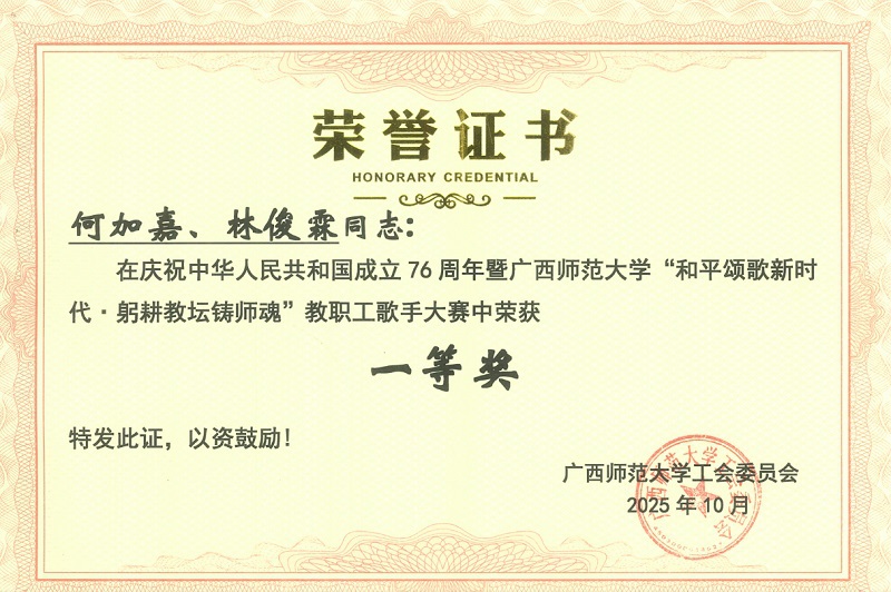 为庆祝中华人民共和国成立76周年,广西师范大学隆重举办“和平颂歌新时代·躬耕教坛铸师魂”教职工歌手大赛,我院何加嘉、林俊霖老师以深情动人的演绎,在众多参赛选手中脱颖而出,喜获大赛一等奖。他们演唱的歌曲《山河无恙在我胸》,以激昂的旋律和真挚的情感,唱出了对祖国的无限热爱与对教育事业的赤诚初心,展现了政治与公共管理学院教师昂扬向上的精神风貌。