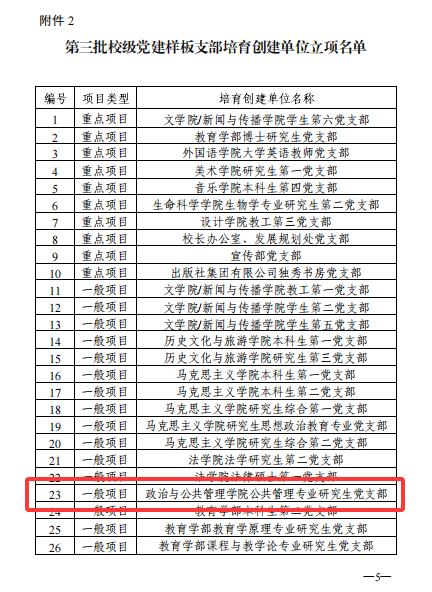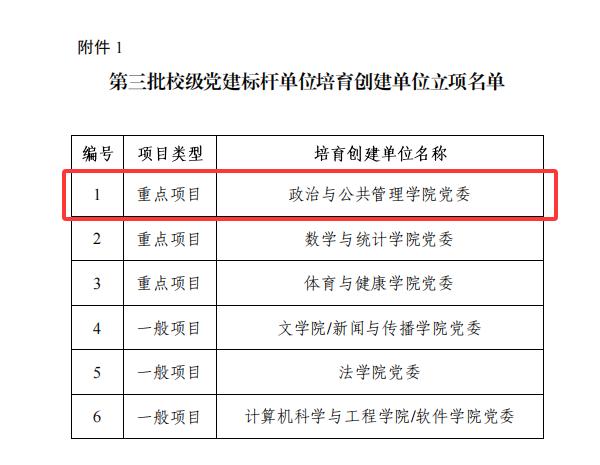 近日,学校正式公布第三批校级党建示范点培育创建单位立项名单,政治与公共管理学院党委凭借扎实的党建基础、鲜明的工作特色和突出的建设成效,成功斩获第三批校级党建标杆单位培育创建单位重点项目、一般项目。