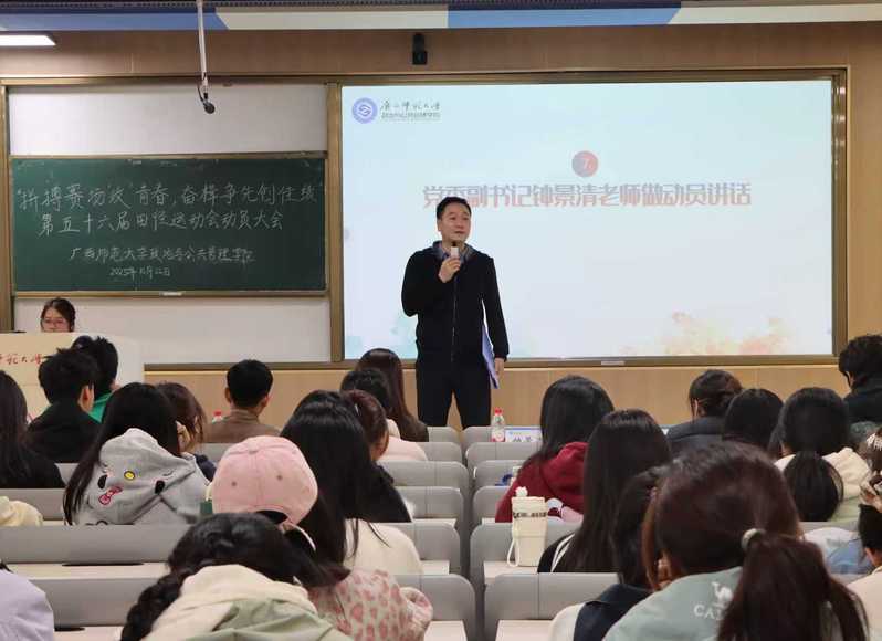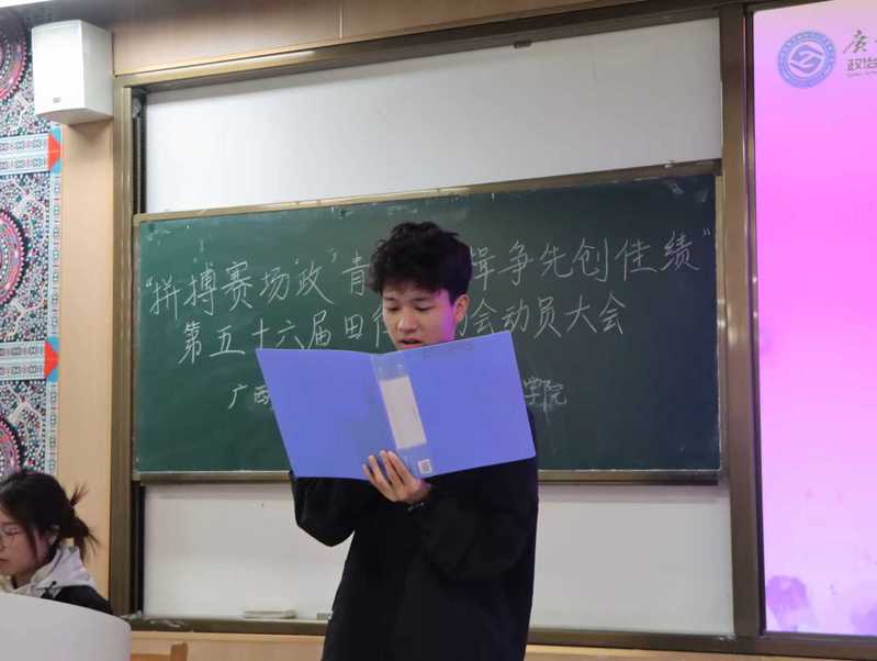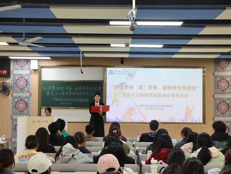 为全面备战我校第五十六届田径运动会,进一步激发师生的参赛热情、凝聚团队力量,政治与公共管理学院于2025年10月22日下午在雁山校区文一区104教室举行动员大会。学院党委副书记钟景清、全体辅导员、教练员代表、学院团委学生会文体部成员以及全体运动员共同出席会议。