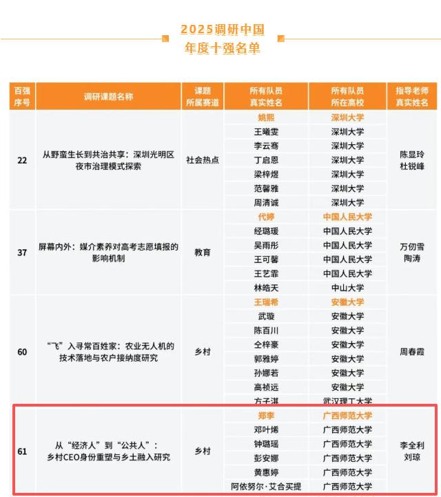 近日,2025年度“调研中国・青年领导力公益计划”年度十强名单正式公布。由广西师范大学政治与公共管理学院李全利和刘琼两位老师共同指导,2022级行政管理本科生郑李、邓叶烯、彭安娜、黄惠婷、钟璐瑶、阿依努尔・艾合买提等同学共同组成的“为村共富”调研团队,荣膺2025调研中国年度十强队伍。