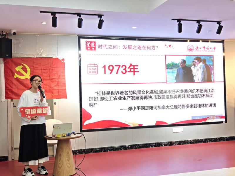 活动还邀请望道微课宣讲团成员秦玉晶进行理论宣讲。她以“时代之问:发展之路在何方?”为切入点,紧密联系桂林在生态文明建设方面取得的显著成果,深化与会同志对“绿水青山就是金山银山”理念的全面理解。交流环节中,与会同志围绕“保护生态环境”畅谈感悟。