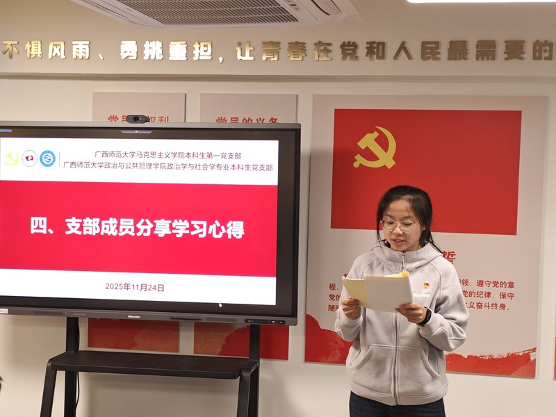 为深入学习党的二十届四中全会精神,强化党员理论素养,加强学院党建交流合作,增强党支部凝聚力。11月24日,政治与公共管理学院政治学与社会学专业本科生党支部联合马克思主义学院本科生第一党支部在怡园社区活动中心开展“学深悟透全会纲,实干笃行治理章”主题党日活动。活动邀请马克思主义学院黄秋香、金俊铭老师以及政治与公共管理学院何加嘉老师共同参与指导。