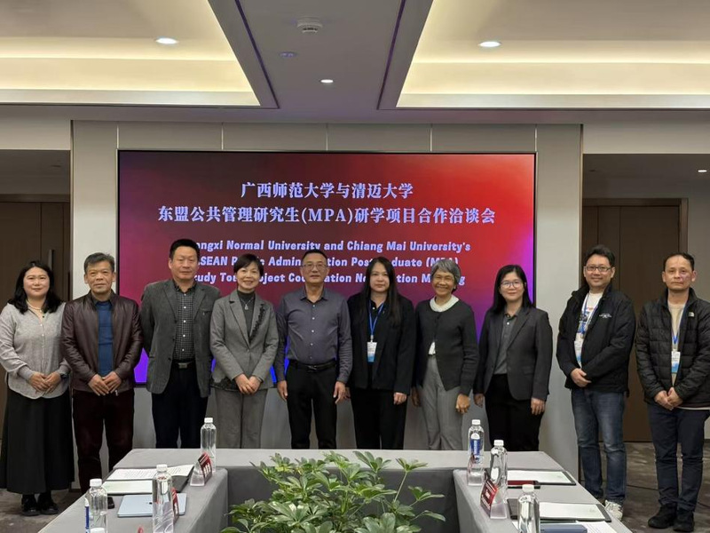 2025年11月21日下午,广西师范大学政治与公共管理学院与泰国清迈大学社会科学学院隆重举行东盟公共管理研究生(MPA)研学项目合作洽谈会。会议由广西师范大学政治与公共管理学院院长周超教授亲自主持,广西师范大学国际交流与合作处处长李冬梅教授、政管学院张雄教授、褚添有教授,以及清迈大学社会科学学院副院长Chanida Suwanprasit等嘉宾共同出席。