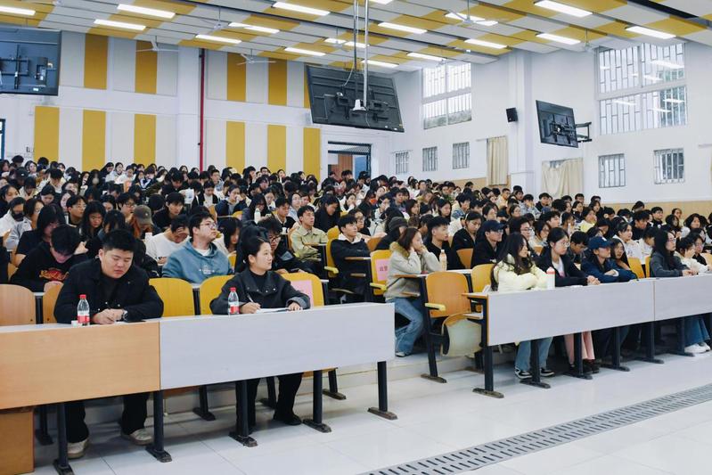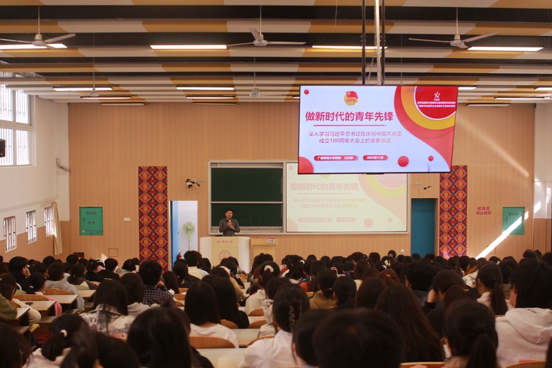为助力入团积极分子精准把握中国共青团百年奋斗的发展脉络,清晰认知共青团的使命宗旨以及新时代青年的责任担当,11月28日,政治与公共管理学院联合马克思主义学院、法学院/律师学院、外国语学院、数学与统计学院,于雁山校区文一108教室同上一堂主题团课。校团委书记江庆彬以《做新时代的青年先锋——深入学习习近平总书记在庆祝中国共青团成立100周年大会上的重要讲话》为主题,与300余名入团积极分子进行了深入交流。
