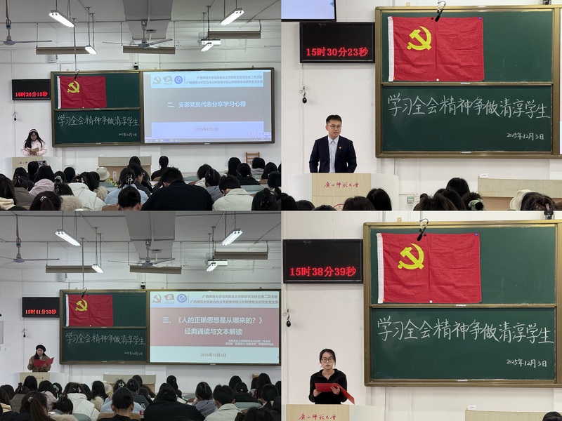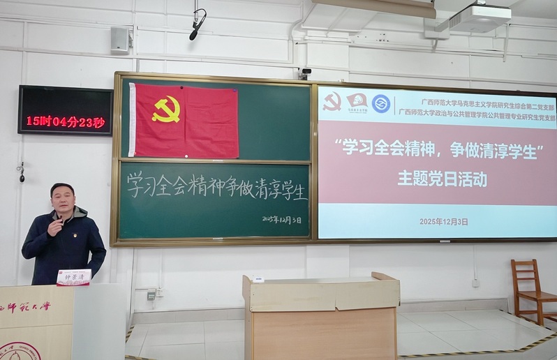 活动特邀政管学院党委副书记、纪委书记钟景清作专题宣讲。他立足两院学科特色解读全会精神,从“品德清淳铸信仰、学风清淳强专业、实践清淳践承诺”三个维度为青年党员明晰成长路径。