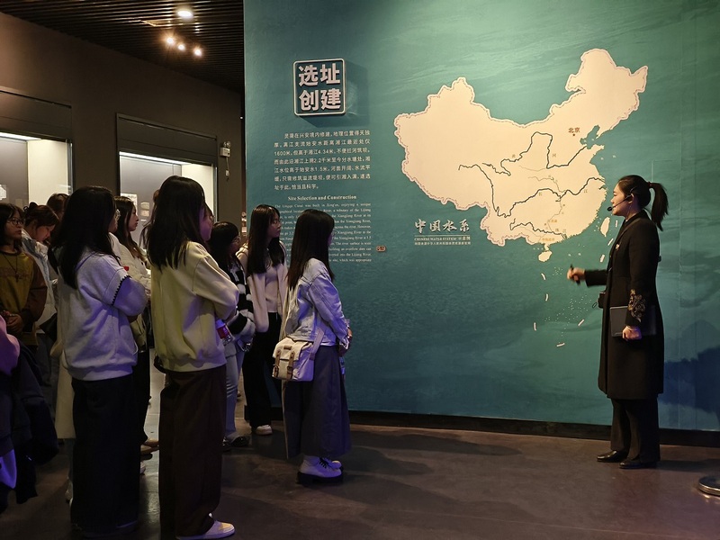 带着理论学习的思考,学生党员们步入灵渠博物院开展沉浸式研学。在讲解员的引导下,他们驻足于文物展陈前,从秦代的青铜工具到历代的修缮碑刻,从水利工程示意图到中原与岭南文化交融的图景,全方位领略灵渠“沟通湘漓、连接南北”的历史功绩以及“北有长城,南有灵渠”的民族智慧。