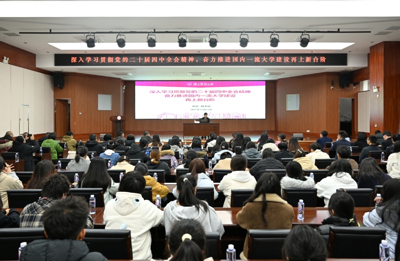 孙杰远校长围绕党的二十届四中全会精神,从六个方面进行了系统阐释和深入解读:一是深刻领会党的二十届四中全会的重大意义;二是准确把握“十五五”时期在基本实现社会主义现代化进程中的重要地位;三是深刻领会“十五五”时期经济社会发展的指导方针和主要目标;四是全面理解“十五五”时期经济社会发展的战略任务和重大举措;五是坚持和加强党的全面领导,凝聚起推进中国式现代化的磅礴力量;六是切实推动全会精神学习转化为推进国内一流大学建设的生动实践。