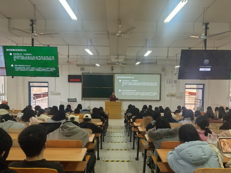 在宣讲会上,文佳慧老师指出,西部计划是国家着眼于人才培养与区域协调发展的重要战略举措。她从自身参加西部计划的经历出发,结合带班学生参与西部计划的实际情况和西部发展的生动案例,围绕西部计划的招募政策、服务范畴、报名流程、优惠待遇、服务期限、生活补贴及升学就业优待等方面展开了细致解读,帮助与会同学清晰厘清了“西部计划是什么”“为何选择西部计划”“如何报名西部计划”三个核心问题。会上,文佳慧老师鼓励同学们将个人发展与国家需求紧密相连,主动到西部去、到基层去、到祖国最需要的地方去建功立业,用青春热血书写属于自己的精彩人生篇章。