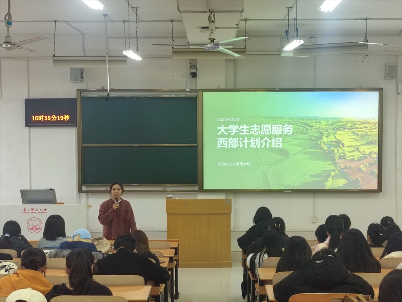 为深入贯彻落实国家引导和鼓励高校毕业生到基层工作的决策部署,进一步动员全院学子积极投身西部计划,在服务国家战略的实践中实现青春价值,政治与公共管理学院于2025年12月30日在文四区202教室举行2026届本科毕业生西部计划政策宣讲会。会议由2026届毕业班辅导员黄菊主持,学院团委书记文佳慧受邀担任主讲嘉宾,为同学们做政策解读。