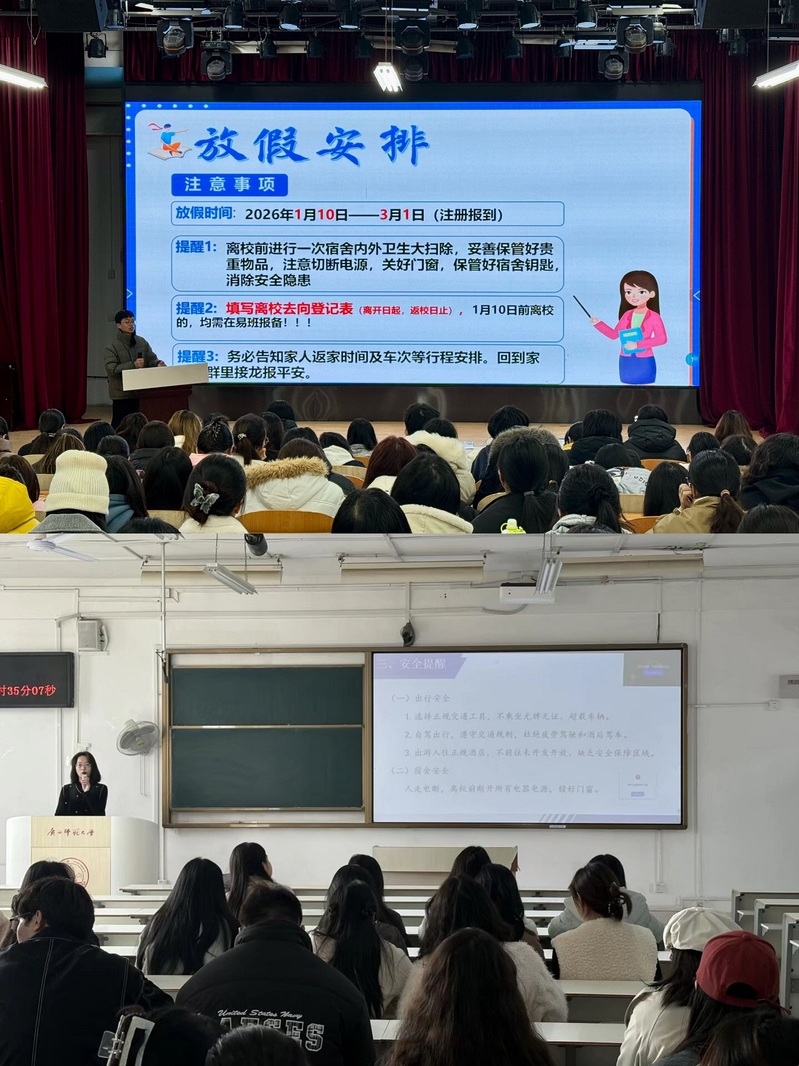 为强化学生安全意识,切实筑牢寒假安全防线,保障学生平安度假、健康成长,在2026年寒假来临之际,政治与公共管理学院组织各年级学生集中开展“同上一堂寒假安全”主题班会课,将安全教育与育人工作深度融合,为学生假期安全保驾护航。