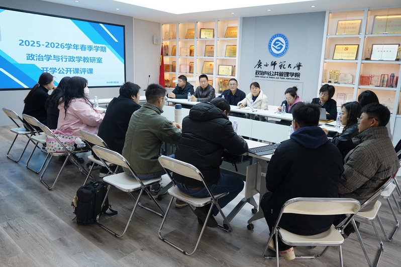 为持续提升课堂教学质量,助力青年教师专业发展,3月2日上午,政治与公共管理学院在雁山校区理科三区201教室举办了2026年春季学期开学公开课活动。本次公开课由蒋烨红博士主讲《地方政府与政治》课程,学院领导、校院两级教学督导员及部分专任教师、辅导员参与观摩,并于课后开展了深入评课交流。