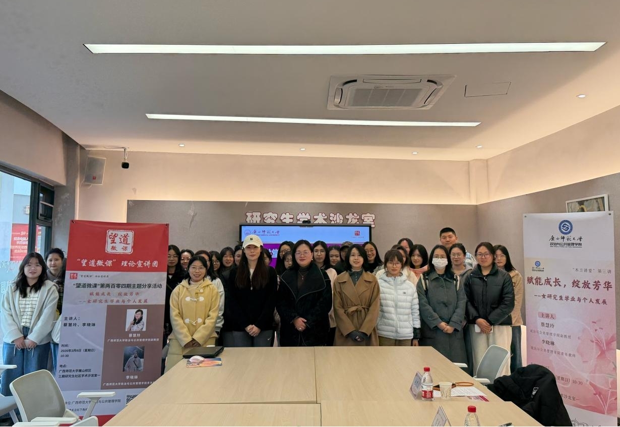 妇女节当天,学院面向不同学生群体举办了专题沙龙,邀请“全国巾帼文明岗”广西师范大学女性发展研究所成员、学院副教授蔡慧玲老师与青年教师李晓琳博士,在三期研究生社区为女研究生成长注入思想动能。蔡慧玲老师从婚恋观切入,鼓励学生珍惜平台、锤炼自我;李晓琳老师结合“底刊现象”剖析学术困境,分享论文写作与自我定位的实用方法。