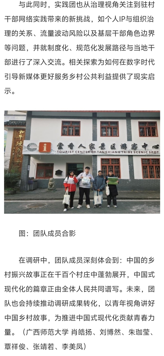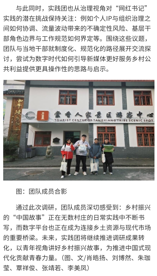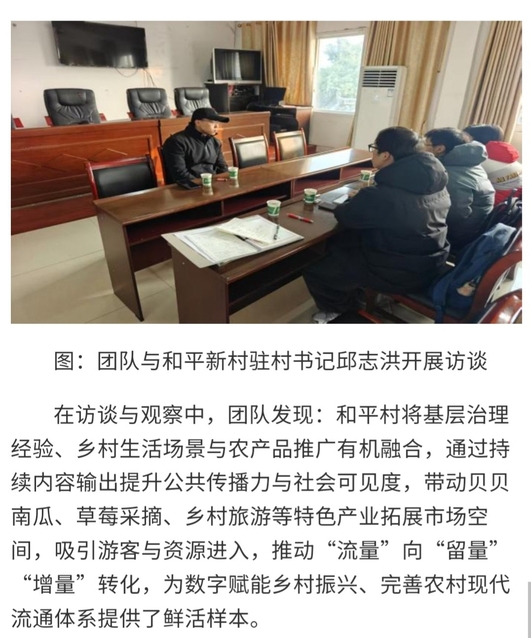 近日,广西师范大学政治与公共管理学院社会实践团队赴重庆市大足区棠香街道和平村,围绕驻村书记网络实践与农村电商高质量发展主题开展专题调研,近距离探寻数字化浪潮下乡村振兴的创新路径。此次调研受到《中国日报网》《中国教育周刊》的关注与报道,现将报道分享如下: