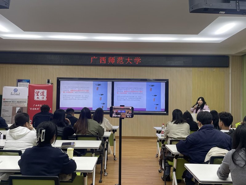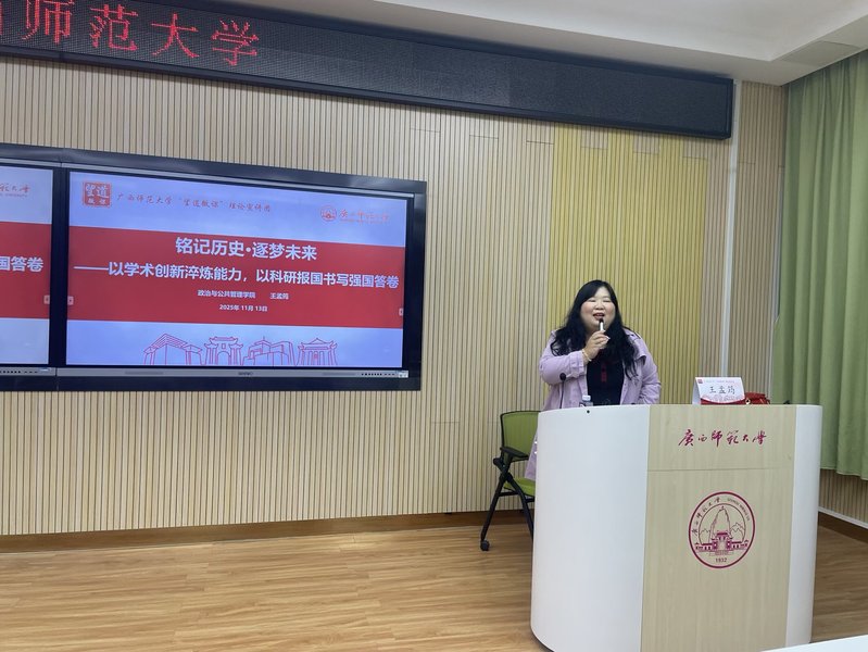 11月13日,政治与公共管理学院在雁山校区文一区107教室成功举办了第一百五十一期“望道微课”理论宣讲活动。本期活动以“铭记历史·逐梦未来——以学术创新淬炼能力,以科研报国书写强国答卷”为主题,特别邀请学院受邀出席中国人民抗日战争暨世界反法西斯战争胜利80周年纪念大会的王孟筠副教授担任主讲,吸引了学院60余名研究生到场参与学习。