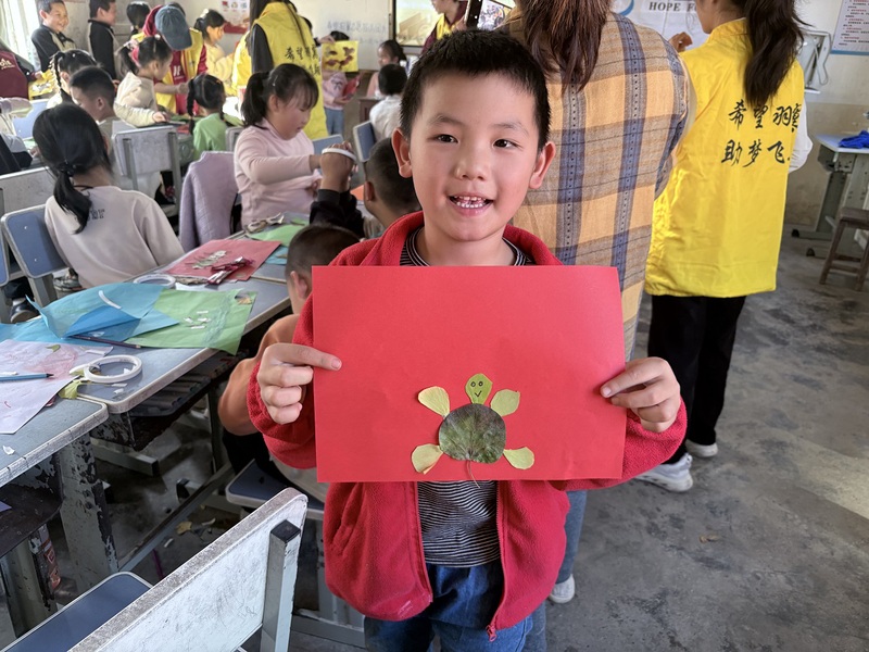 活动以“自然探索+环保启蒙”为主线,内容精彩纷呈。在宣讲人甘宇杰的引导下,孩子们通过“寻找两片不同树叶”的趣味任务,迅速融入自然观察情境,切身感受生物多样性的奇妙。随后,“树叶浮雕制作”与“树叶创意拼贴”手工环节陆续开展。孩子们在志愿者协助下精心雕刻叶脉、大胆拼贴创作,一个个生动的动物与房屋图案跃然纸上。过程中,志愿者向孩子们传递“每片叶子皆独一无二,正如每个你都熠熠生辉”的认知理念,并树立“爱护草木、守护自然”的环保意识,在激发创造力的同时,悄然播撒环保与自信的种子.