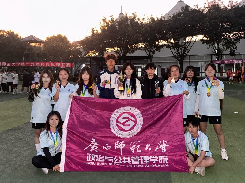2025年11月23日,2025年广西师范大学第十九届足球联赛落下帷幕。政治与公共管理学院女子、男子足球队团结一心、奋勇拼搏,凭借出色的表现和顽强的意志斩获佳绩。其中,女子足球队荣获季军,突破学院女子在该赛事的最佳成绩记录,男子足球队则荣获第六名!此外,2025级本科生杭炫希、2022级本科生许源凭借进球数量最多,分别荣获女足、男足“最佳射手”称号。