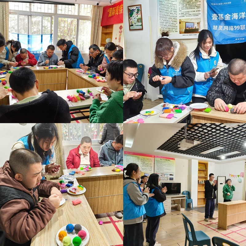 活动中,志愿者们精心策划了趣味性与互动性兼备的环节。在热身环节,“眼疾手快”游戏迅速点燃现场热情,参与者们反应敏捷、默契配合,抢杯子、拍手掌的欢快节奏此起彼伏,简单的互动拉近了彼此距离,笑声如涟漪般荡漾在活动室的每个角落。在粘土手工制作环节,志愿者们悉心指导揉、捏、搓、压等基础技巧,与学员们围坐协作,共同创作出憨态可掬的小动物、色彩斑斓的花朵等作品。专注的指尖与学员们的欢笑交织,创意与温情悄然流淌,许多学员自豪地举起亲手完成的杰作展示。