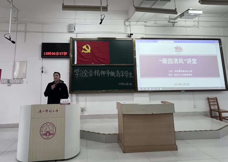 12月3日,由广西师范大学党风廉政建设办公室主办、政治与公共管理学院承办的“雁园清风”讲堂首场讲座,于雁山校区顺利举行。本次活动以“学习全会精神,争做清淳学生”为主题,特邀政治与公共管理学院党委副书记、纪委书记钟景清老师担任主讲人,共有百余名学生积极参与。